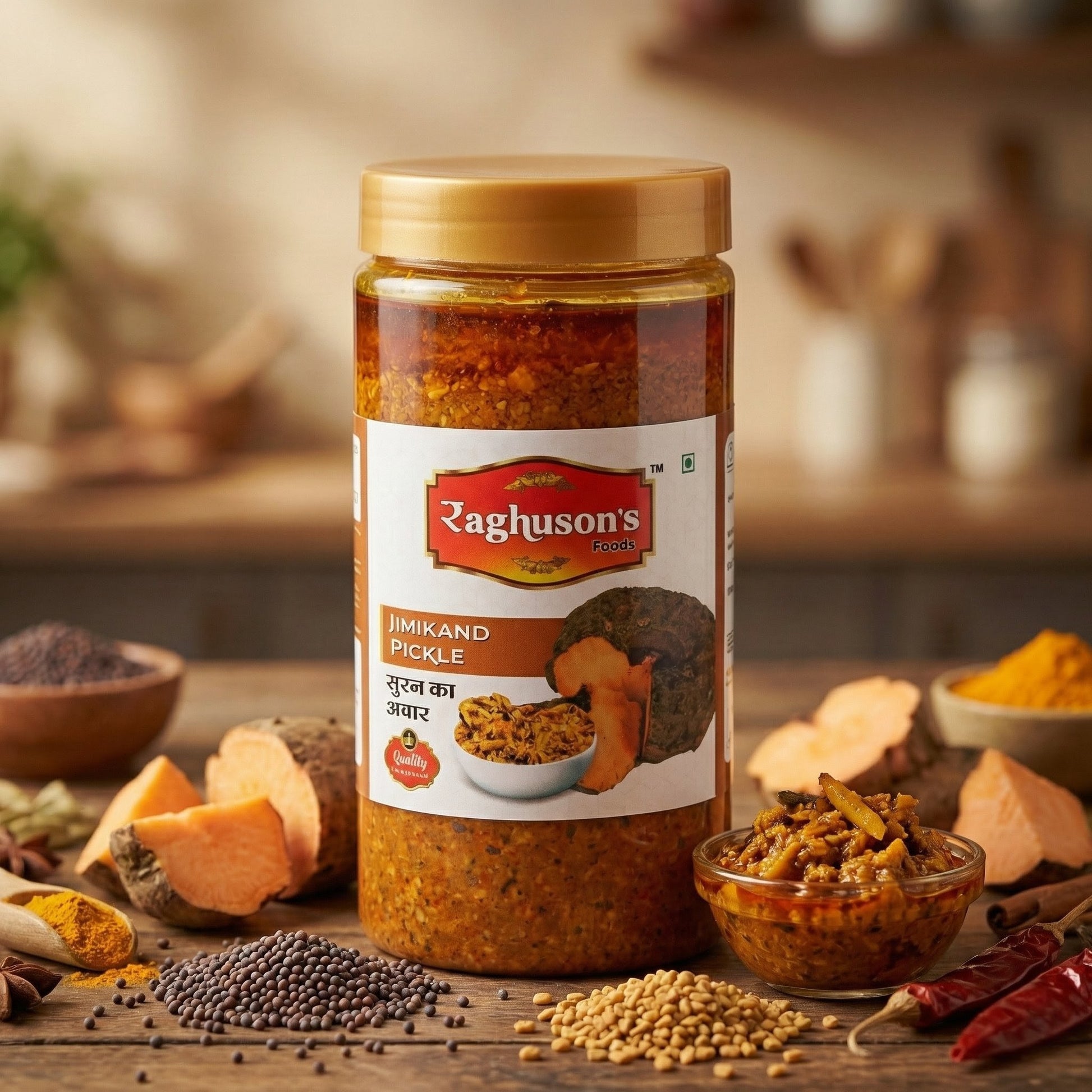 Rediscover the lost art of traditional pickling with Raghusons Foods Jimikand (Elephant Yam) Pickle. Known for its distinct, savory texture and gut-friendly benefits, our Jimikand pickle is more than just a condiment—it is a labor of love.